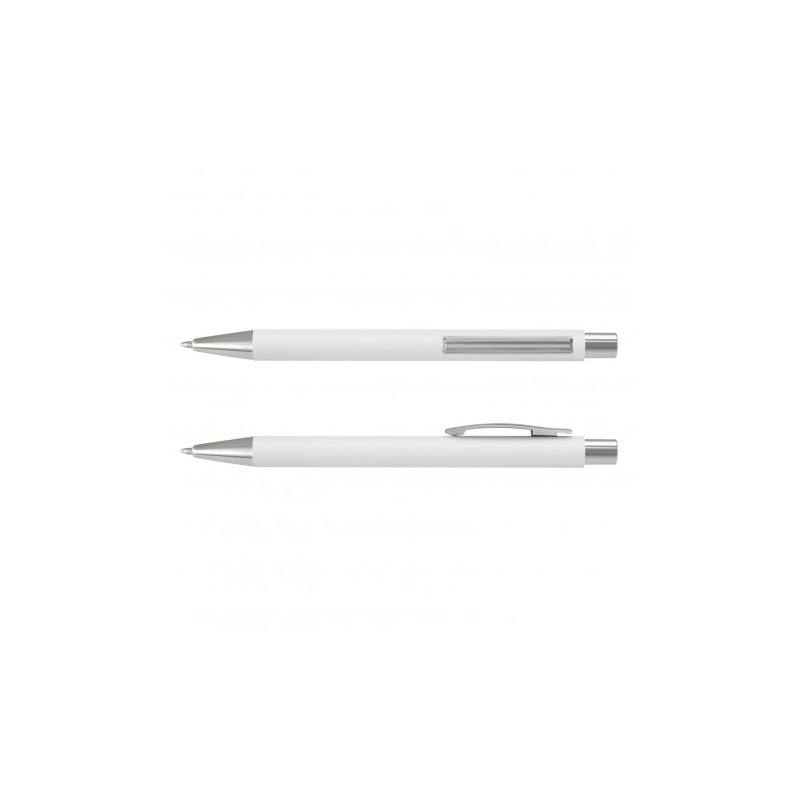 Push button ballpoint pen with chrome fittings. Flat white panel on each side allows for a good decoration area. Writing distance: 2.1 kilometres. TC roller ball. Nero pigment ink. ABS body