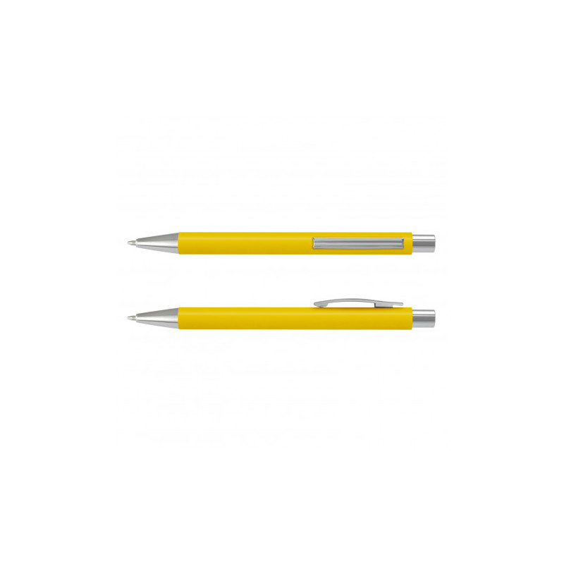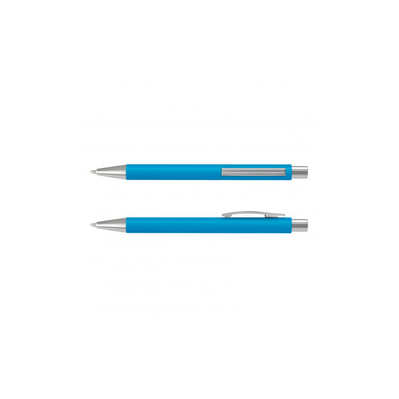 Solid colour push button ballpoint pen with chrome highlights. Writing distance: 2.1 kilometres. TC roller ball. Blue pigment ink. ABS