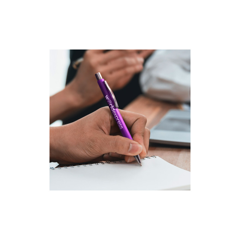 Coloured metallic barrel twist action ballpoint pen with chrome highlights. Writing distance: 2.1 kilometres.