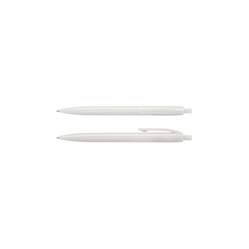 Push button ballpoint pen with chrome fittings. Flat white panel on each side allows for a good decoration area. Writing distance: 2.1 kilometres. TC roller ball. Nero pigment ink. ABS body