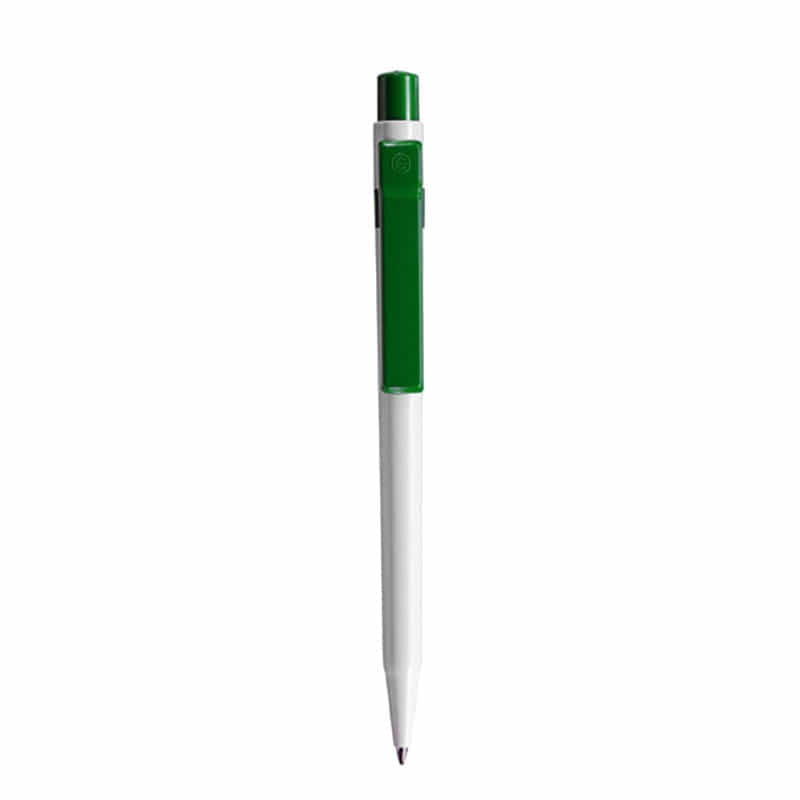 Push button ballpoint pen with black ink. White barrel with chrome button, tip and highlight ring. Matching coloured clip and grip. Writing distance: 2.1 kilometres.