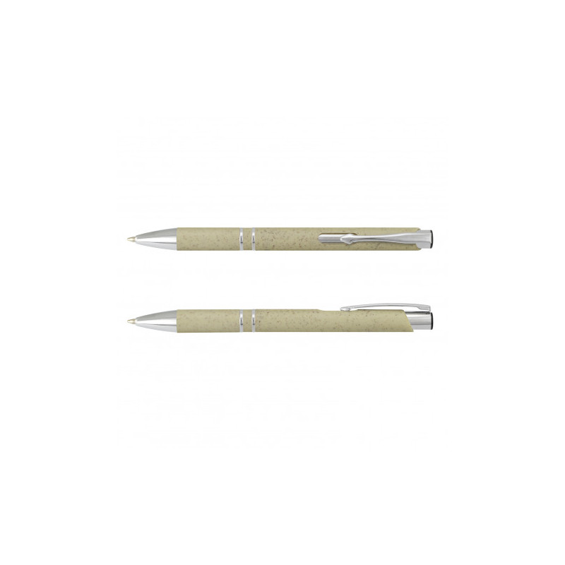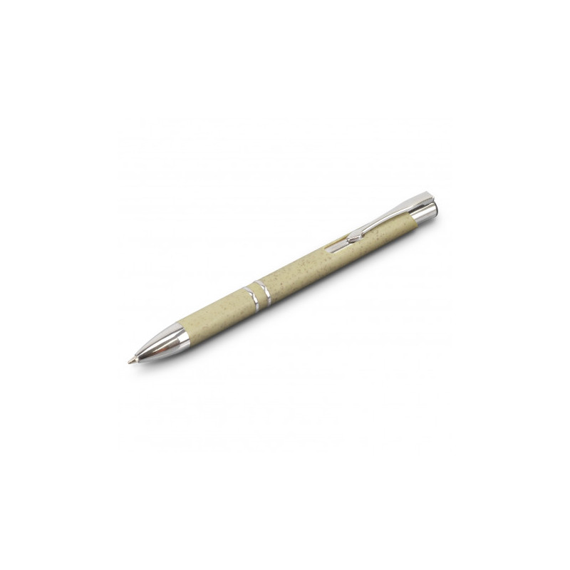 Push button ballpoint pen. Made from a 50/50 blend of wheat fibre and polypropylene. 4 different ink colours Black, Blue, Green, Red, Grey grip.Eco Credentials: Wheat fibre - by product, and printed using renewable energy.