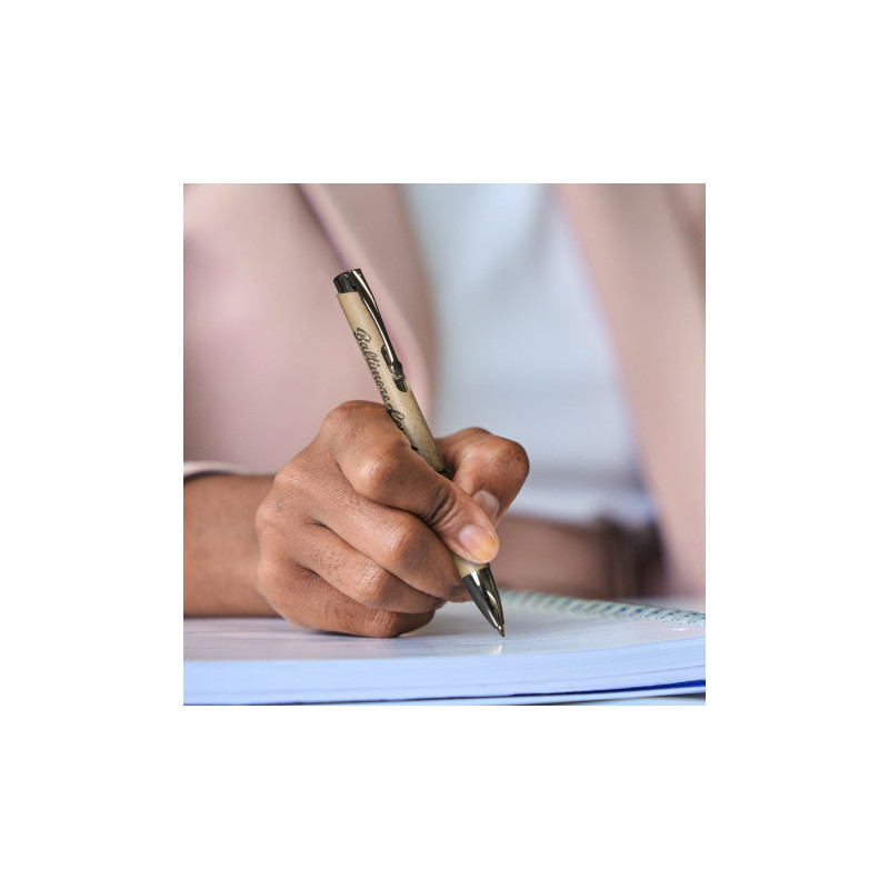 Retractable ballpoint pen made from a 60/40 blend of polypropylene and bamboo fibre. The unique textured barrel provides a comfortable grip and a large clip creates a large branding area. Bambusa has a black refill with 800m of German manufactured Documental ink.