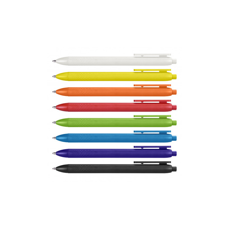 White push button ballpoint pen with coloured comfort grip. Writing distance: 2.1 kilometres.