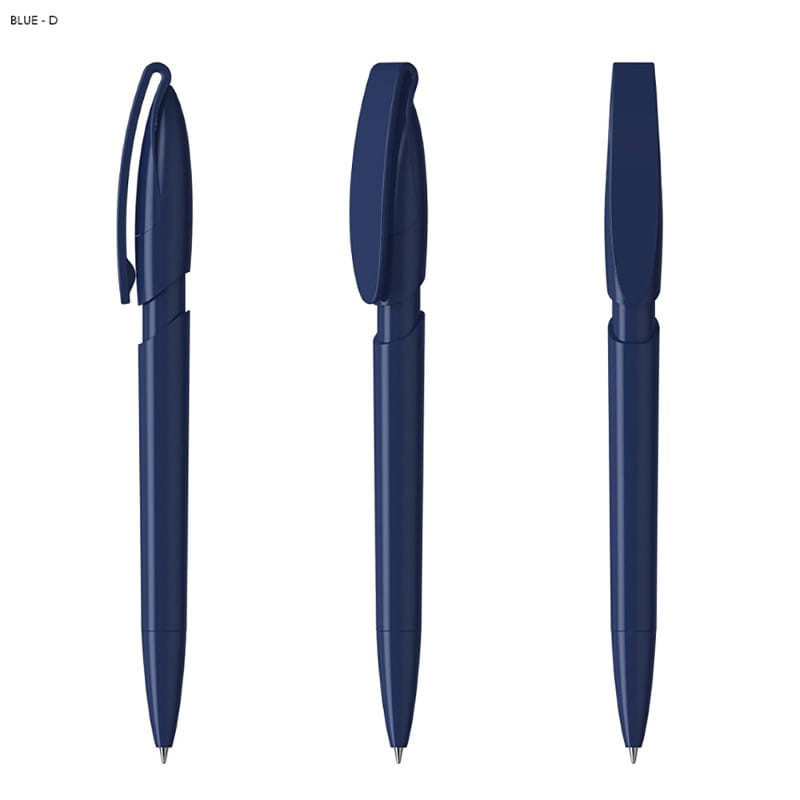 Solid colour push button ballpoint pen with chrome highlights. Writing distance: 2.1 kilometres. TC roller ball. Blue pigment ink. ABS