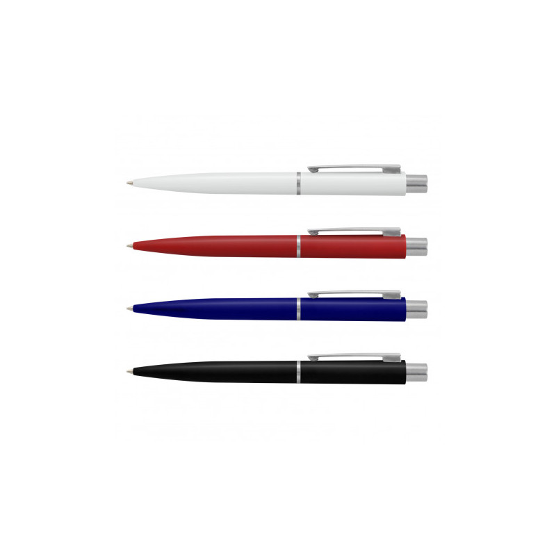 White barrel push button ballpoint pen. With silver accents and coloured grips. Writing distance: 2.1 kilometres.