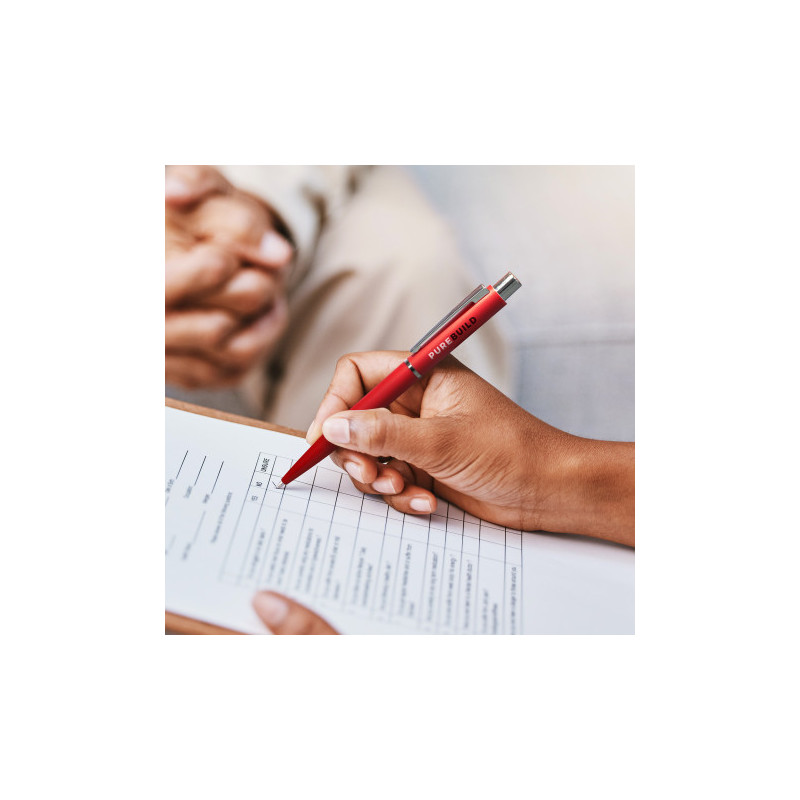 Retractable plastic ballpoint pen which has a soft-touch matte finish and shiny chrome trim. It has a black refill with 1200 metres of German manufactured Dokumental ink.