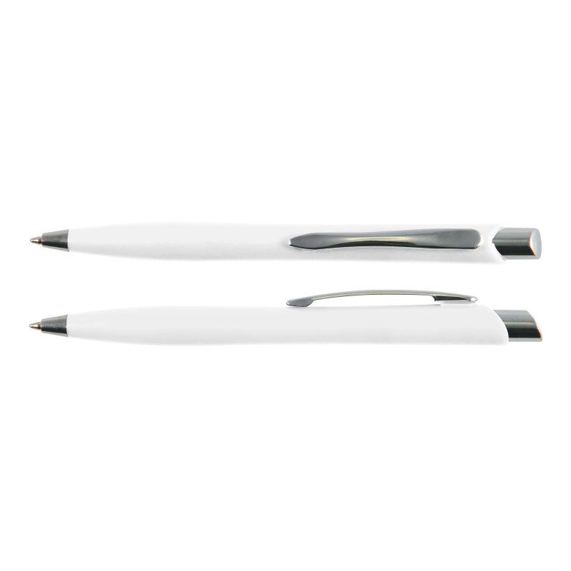 Push button ballpoint pen with chrome fittings. Flat white panel on each side allows for a good decoration area. Writing distance: 2.1 kilometres. TC roller ball. Nero pigment ink. ABS body