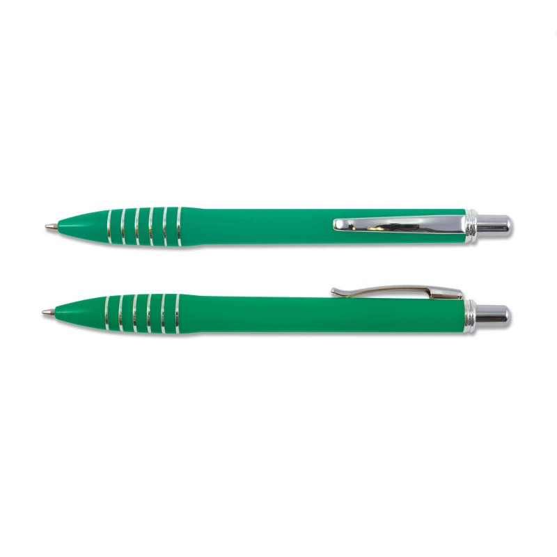 Push button ballpoint pen with solid colour rubber grip. Writing distance: 2.1 kilometres.