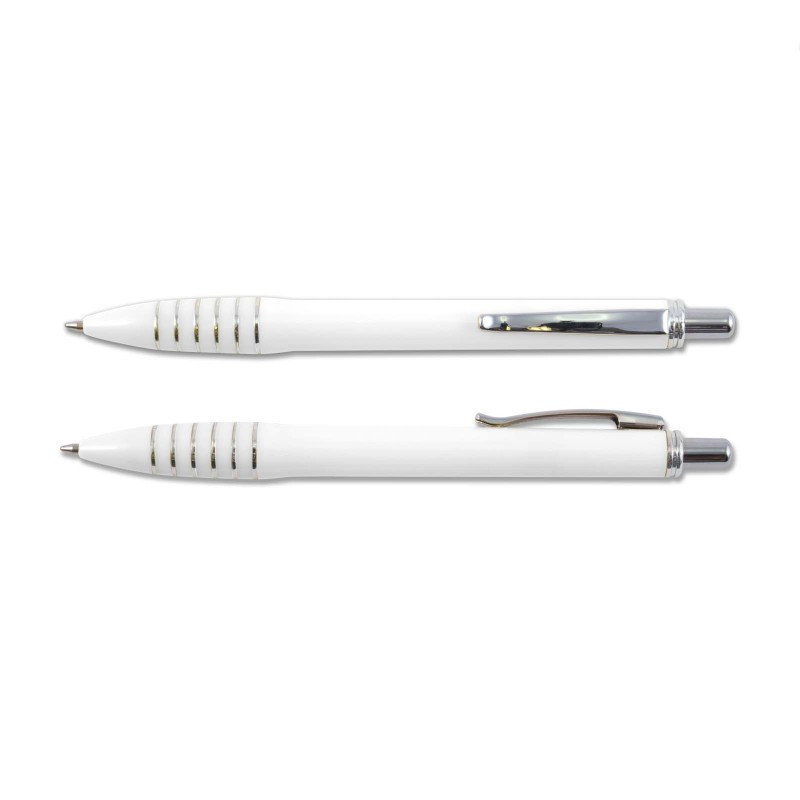 White barrel push button ballpoint pen. With silver accents and coloured grips. Writing distance: 2.1 kilometres.