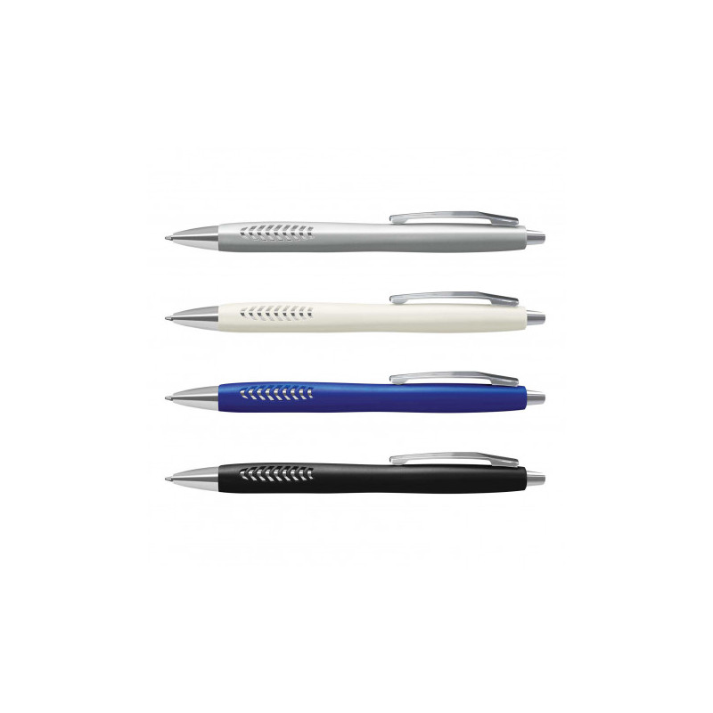 White barrel push button ballpoint pen. With silver accents and coloured grips. Writing distance: 2.1 kilometres.