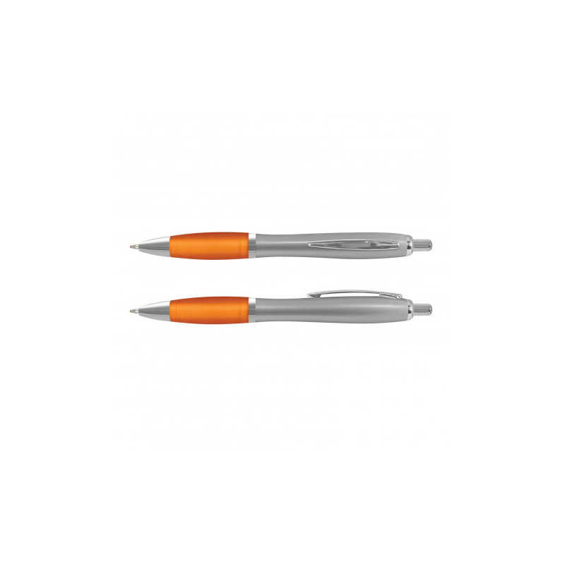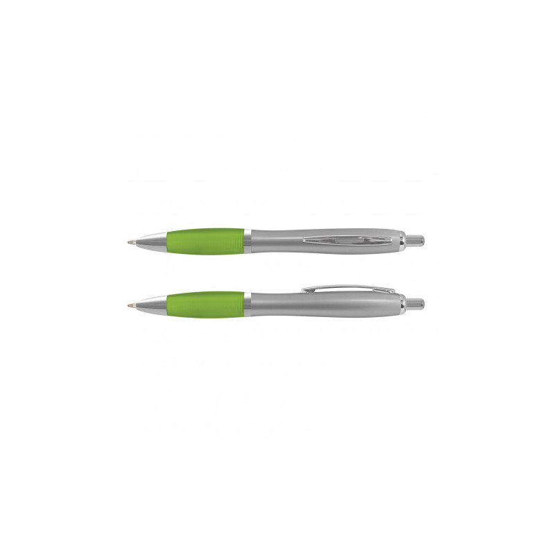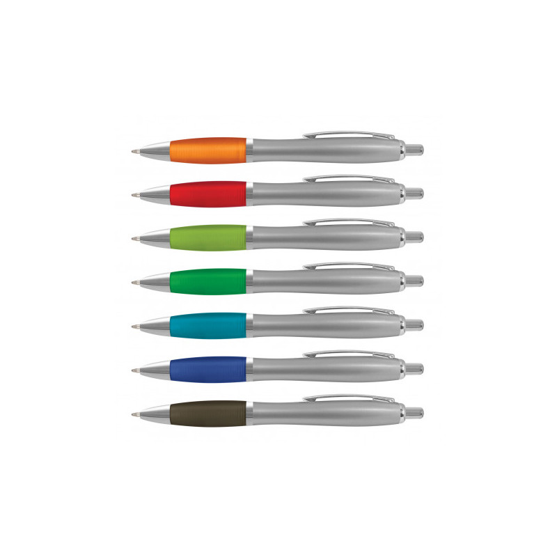 Push button top ballpoint pen with comfort grip. Silver barrel with coloured grip. Writing distance: 2.1 kilometres.