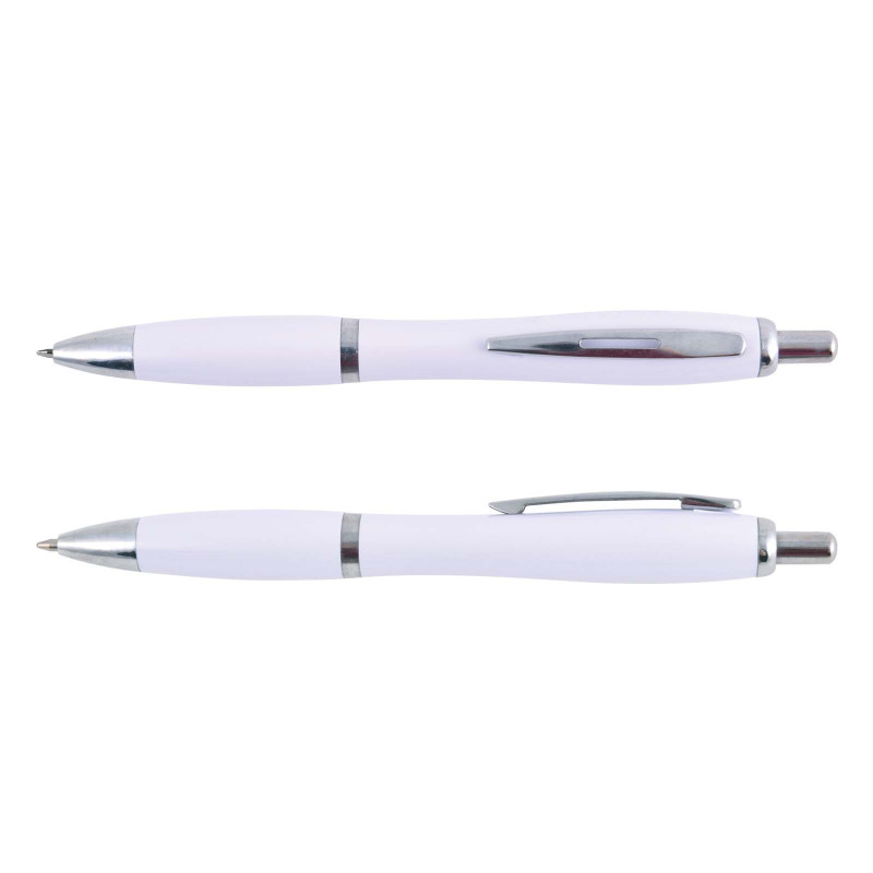 Push button ballpoint pen with black ink. White barrel with chrome button. Matching coloured clip and dimple grip. Writing distance: 2.1 kilometres.