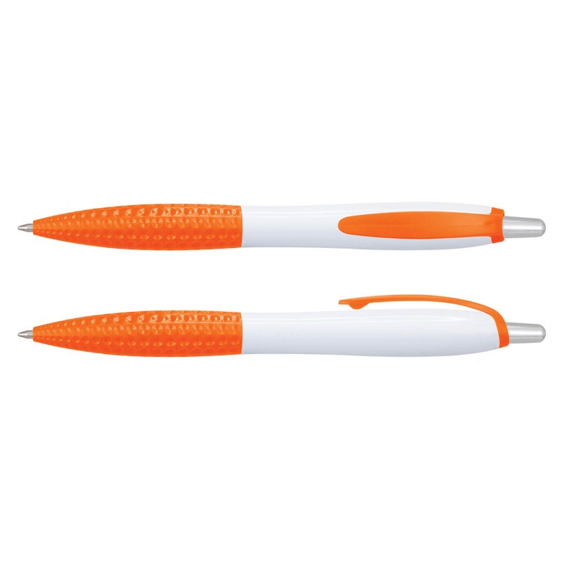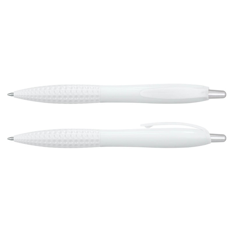 Push button ballpoint pen with black ink. White barrel with chrome button. Matching coloured clip and dimple grip. Writing distance: 2.1 kilometres.