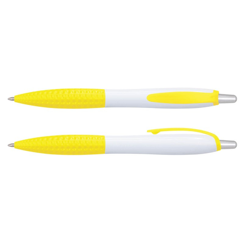 White barrel push button ballpoint pen. With silver accents and coloured grips. Writing distance: 2.1 kilometres.