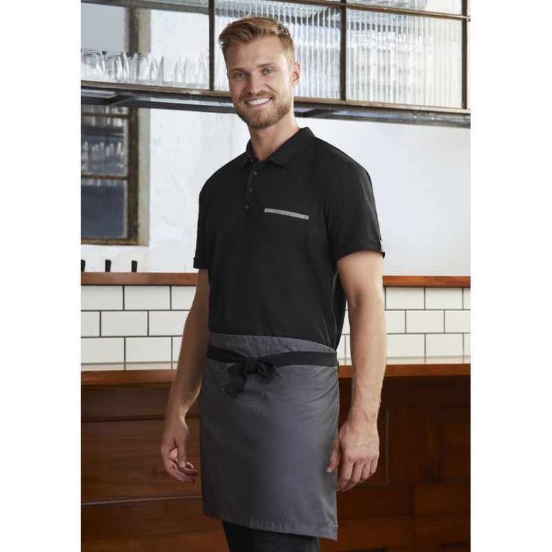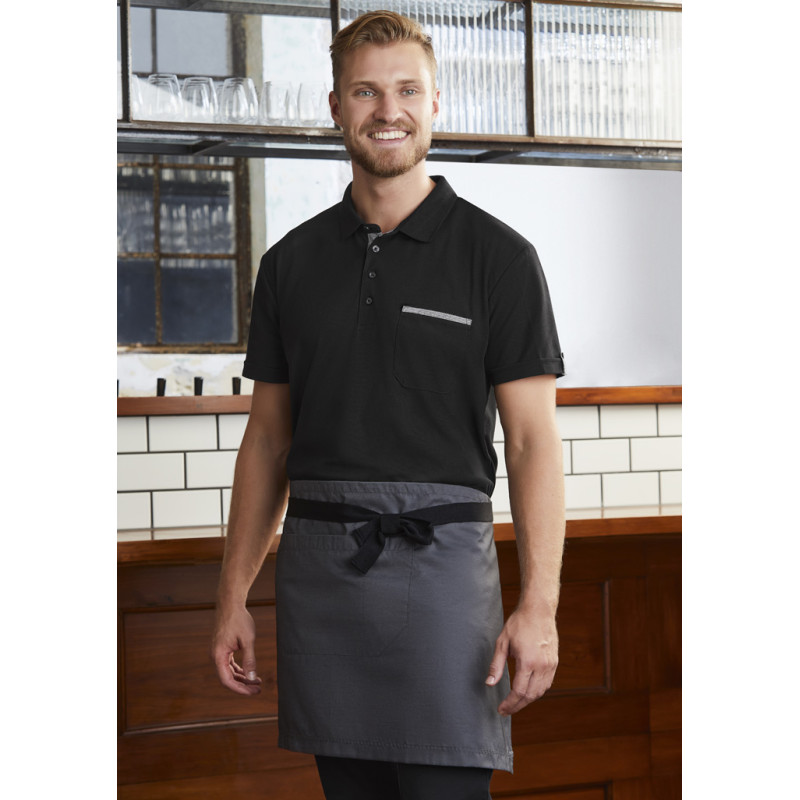 Short waisted, above the knee length,Unique styling,Towel loop at back of apron,1 Large central front pocket with special side slide pen and bottle opener provision,Free size 86cm x 50cm (34in x 20in),Available in Black only. Fabric: 65% Polyester, 35% Cotton Twill,190 GSM.