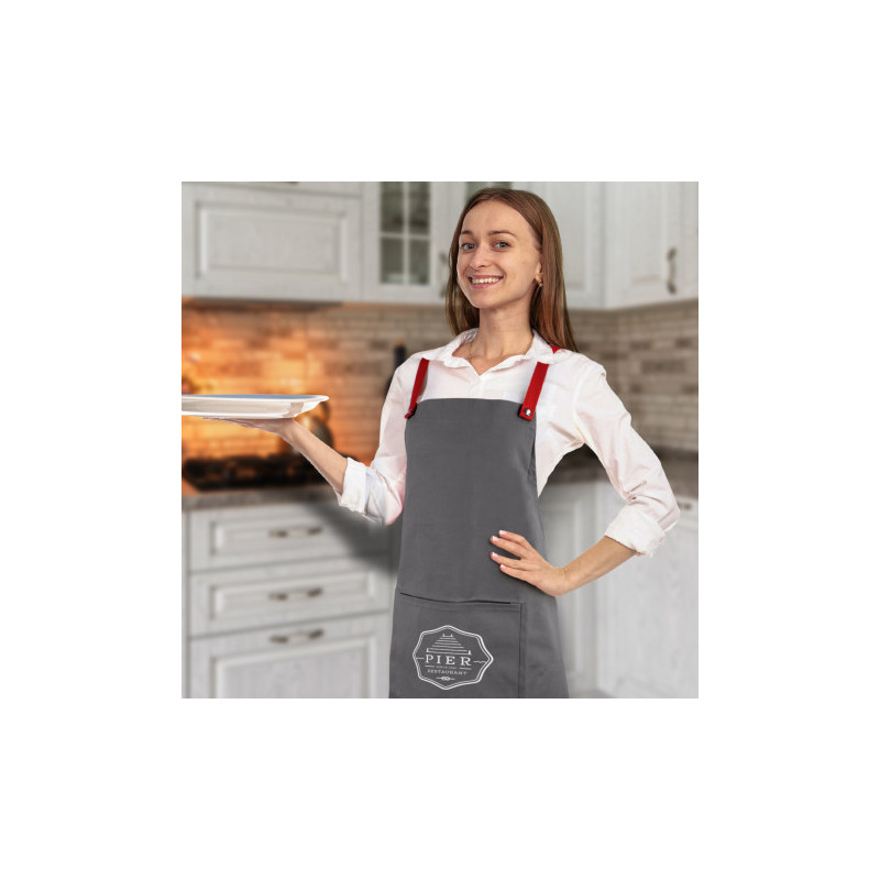 Bib apron with adjustable halter self fabric strap around neck,Unique styling,Towel loop at back of apron,1 Large central front pocket with special side slide pen and bottle opener provision,Free size 97cm x 86cm. Fabric: 65% Polyester, 35% Cotton Twill,190 GSM.