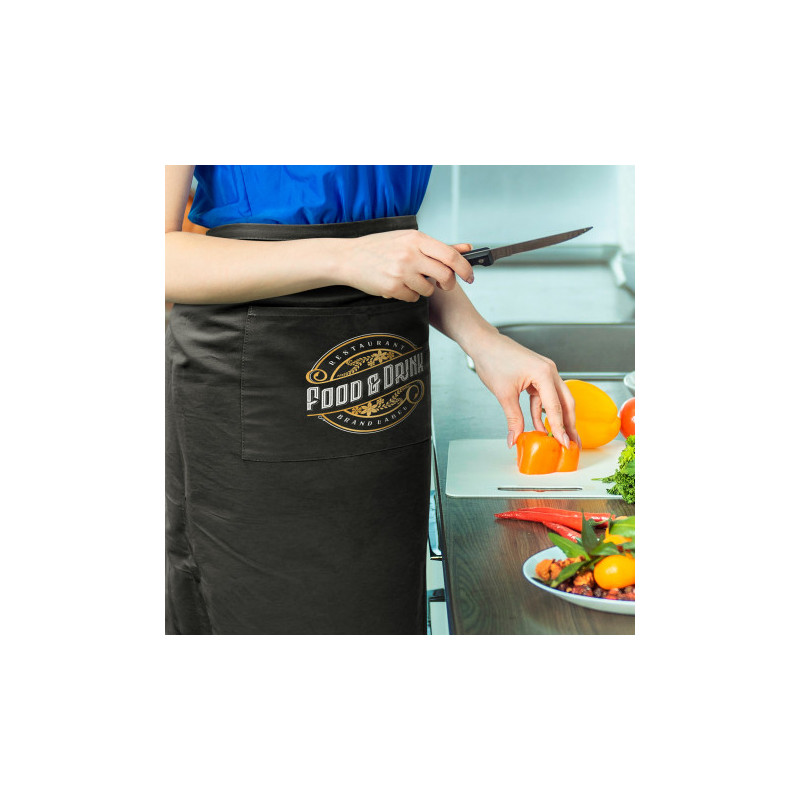 Short waisted, above the knee length,Unique styling,Towel loop at back of apron,1 Large central front pocket with special side slide pen and bottle opener provision,Free size 86cm x 50cm (34in x 20in),Available in Black only. Fabric: 65% Polyester, 35% Cotton Twill,190 GSM.