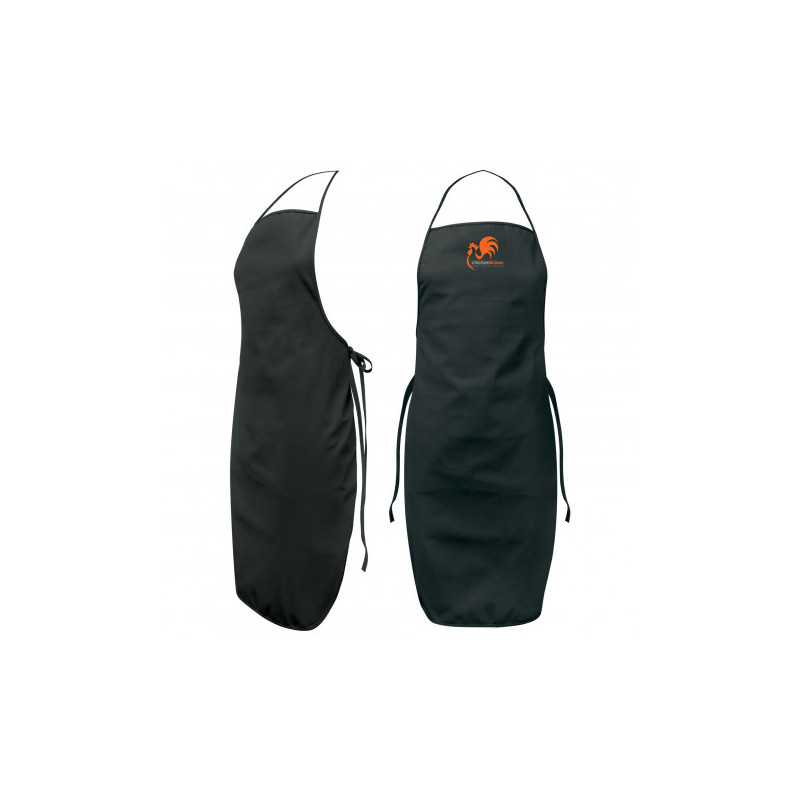 Full length Continental style with fold over waist,Unique styling,Towel loop at back of apron,1 Large central front pocket with special side slide pen and bottle opener provision,Front centre split for ease of movement,Free size 86cm x 86cm (33.9in x 33.9in),Available in Black only. Fabric: 65% Polyester, 35% Cotton Twill,190 GSM.