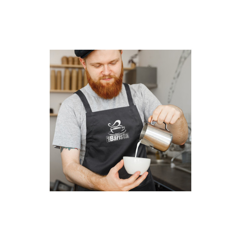Short waisted, above the knee length,Unique styling,Towel loop at back of apron,1 Large central front pocket with special side slide pen and bottle opener provision,Free size 86cm x 50cm (34in x 20in),Available in Black only. Fabric: 65% Polyester, 35% Cotton Twill,190 GSM.
