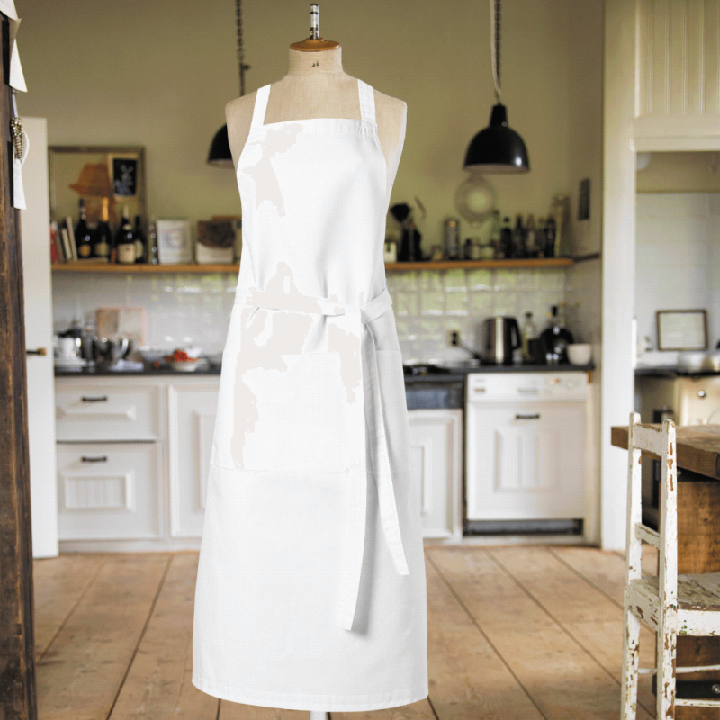 Bib apron with adjustable halter self fabric strap around neck,Unique styling,Towel loop at back of apron,1 Large central front pocket with special side slide pen and bottle opener provision,Free size 97cm x 86cm. Fabric: 65% Polyester, 35% Cotton Twill,190 GSM.