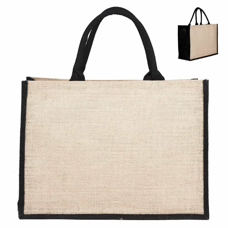 Extra-large laminated jute tote bag with a gusset and padded cotton handles. It is available in four colours where the gussets and handles are dyed to match.