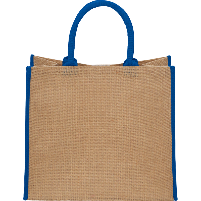 Extra-large laminated jute tote bag with a gusset and padded cotton handles. It is available in four colours where the gussets and handles are dyed to match.