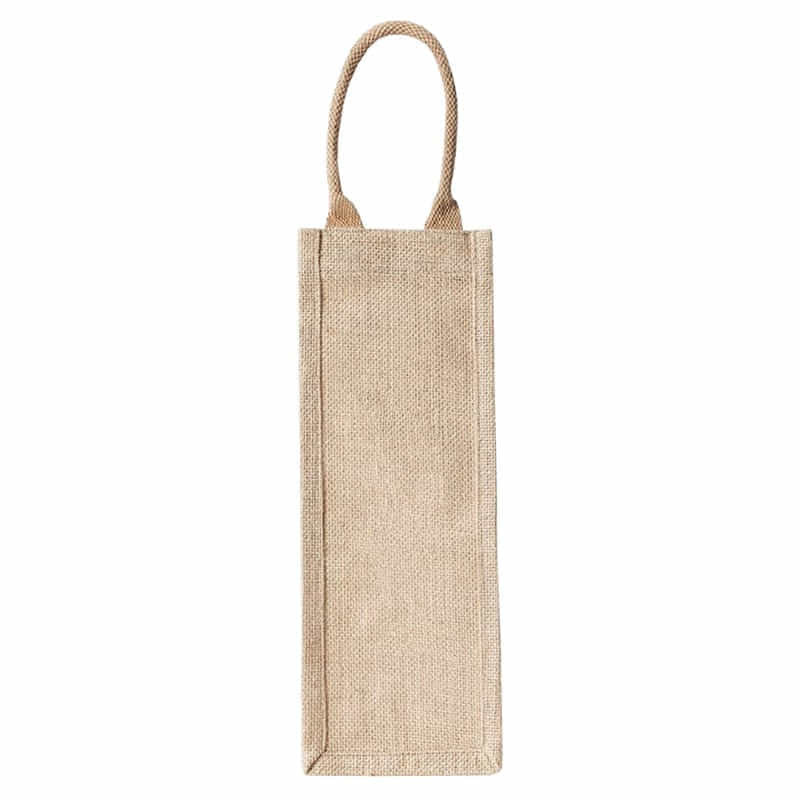 Single bottle wine carry bag which is manufactured from laminated natural jute with unbleached woven cotton handles.