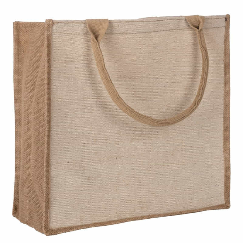 Extra-large laminated jute tote bag with a gusset and padded cotton handles. It is available in four colours where the gussets and handles are dyed to match.