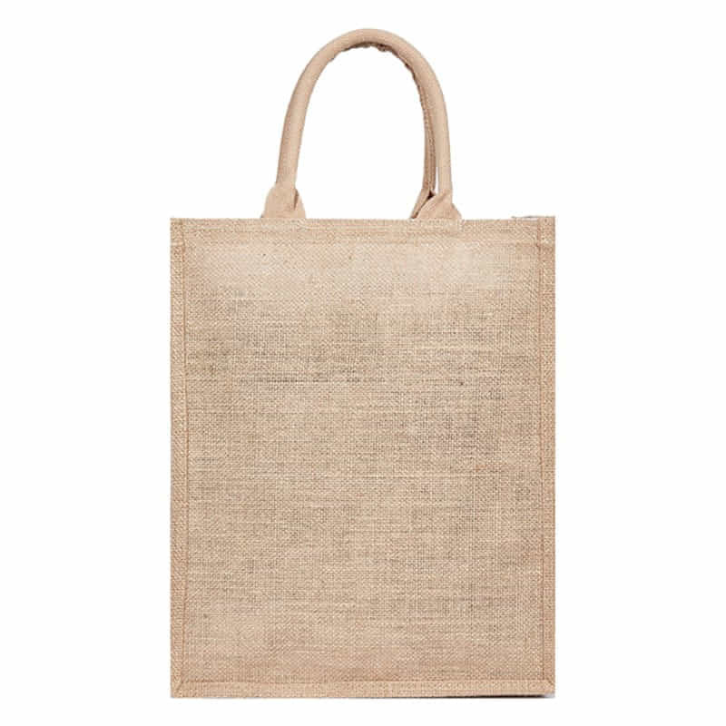 Classic laminated jute tote bag with a large gusset and padded cotton handles. The bag and handles have been dyed to match.