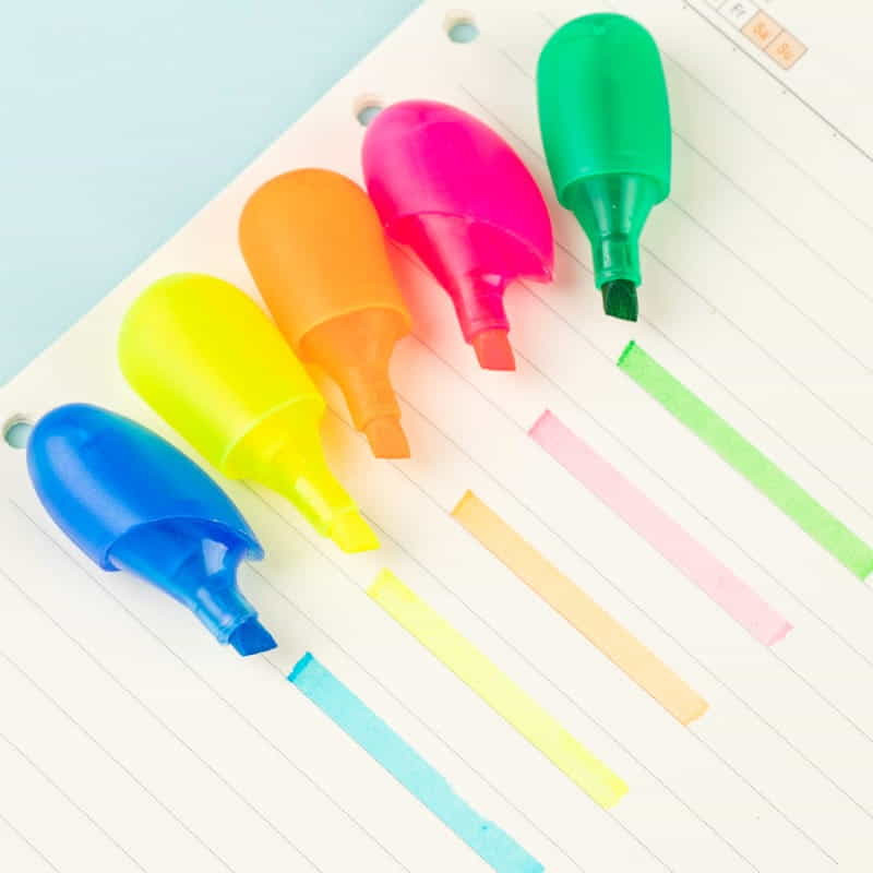 A novel but effective highlighter that uses fluorescent coloured wax instead of ink. Unlike ink, wax will not dry up so the highlighter has a shelf life of many years and will always work when required.