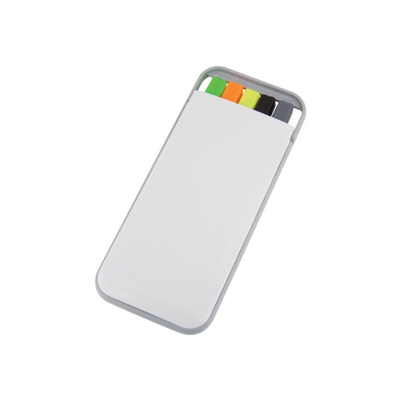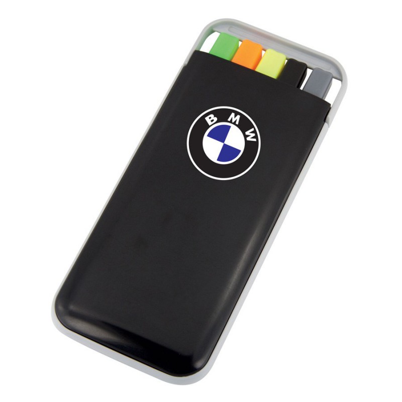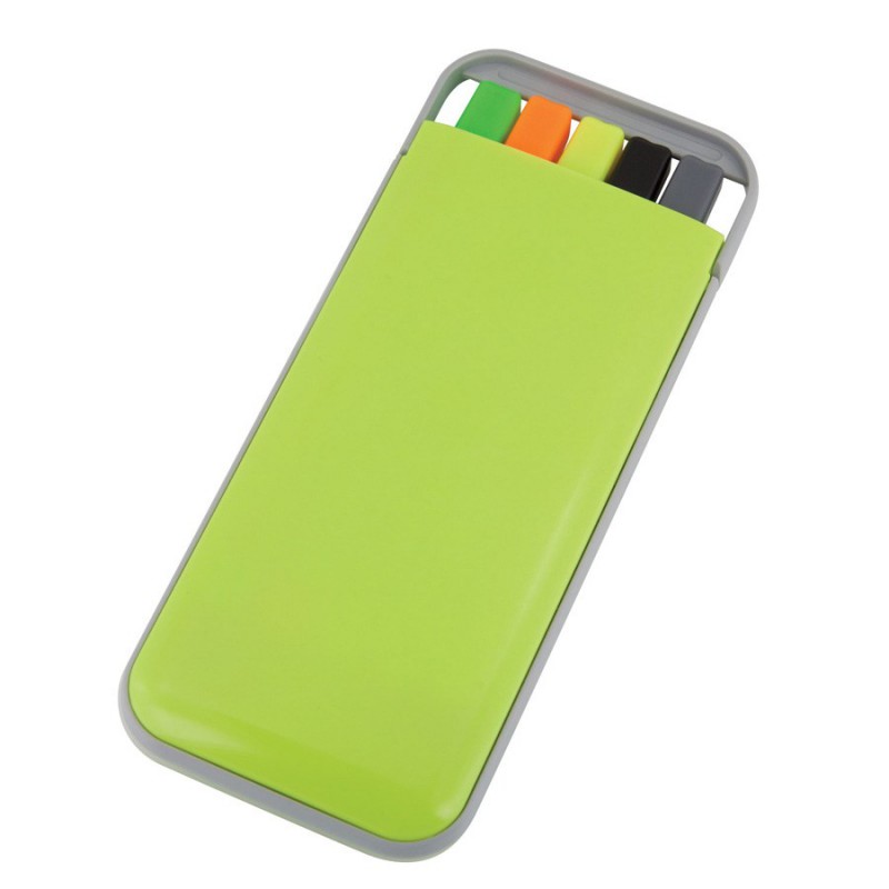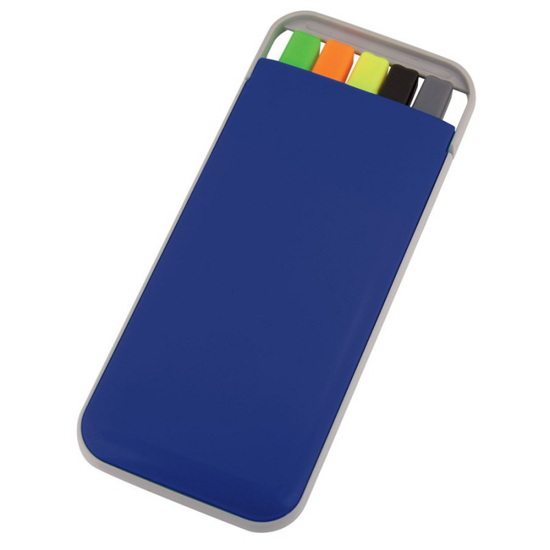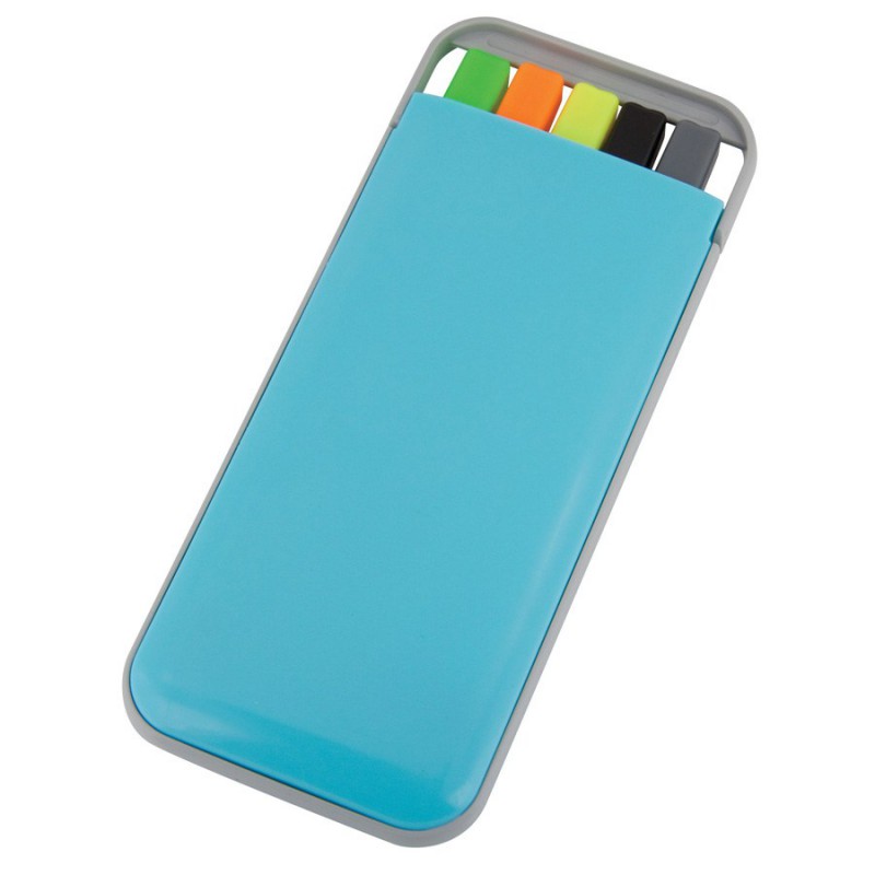 Set of five different coloured highlighters in a stylish plastic case which has a very large branding area. The spring-loaded clip holds the highlighters securely and when flipped open it doubles as a handy desk stand.