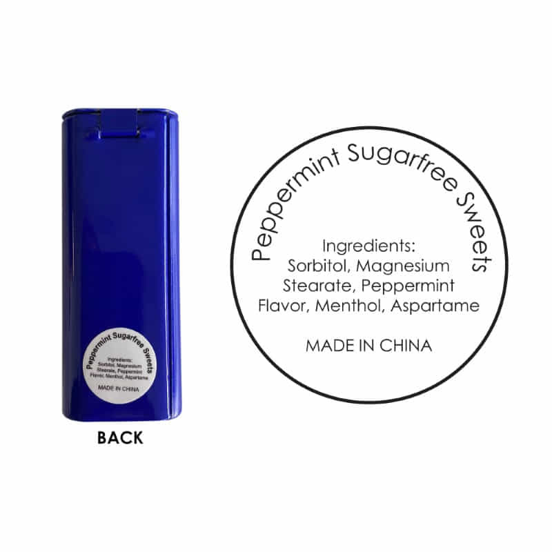Food grade metal rectangular mint tin filled with sugar free breath freshener mints(approximately 170pcs) and full ingredient and nutritional information is printed on the back of the tin. Sealed with plastic wrapping on the side.
