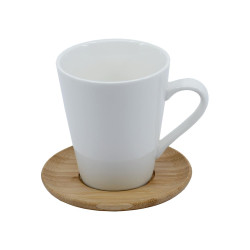 A simple and common design 300ml ceramic coffee mug, but the combination of ceramic and bamboo makes it distinctive. The bamboo base keeps your hands cool and drinks hot, handwashing only and microwave not recommended.