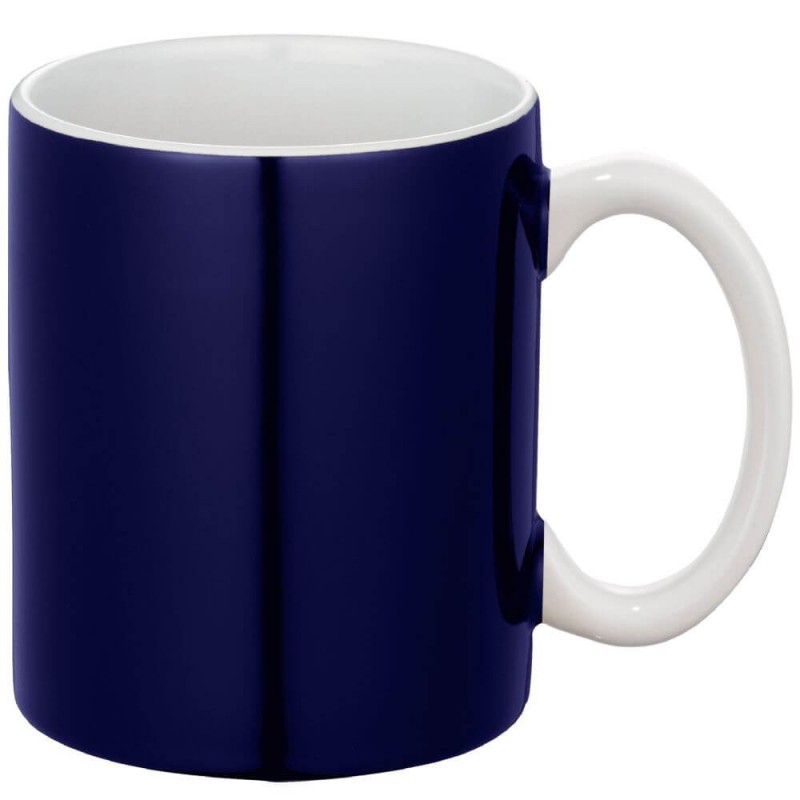 Unique design mug with white lining, external blue glossy finish and blue coloured handle.350ml capacity.