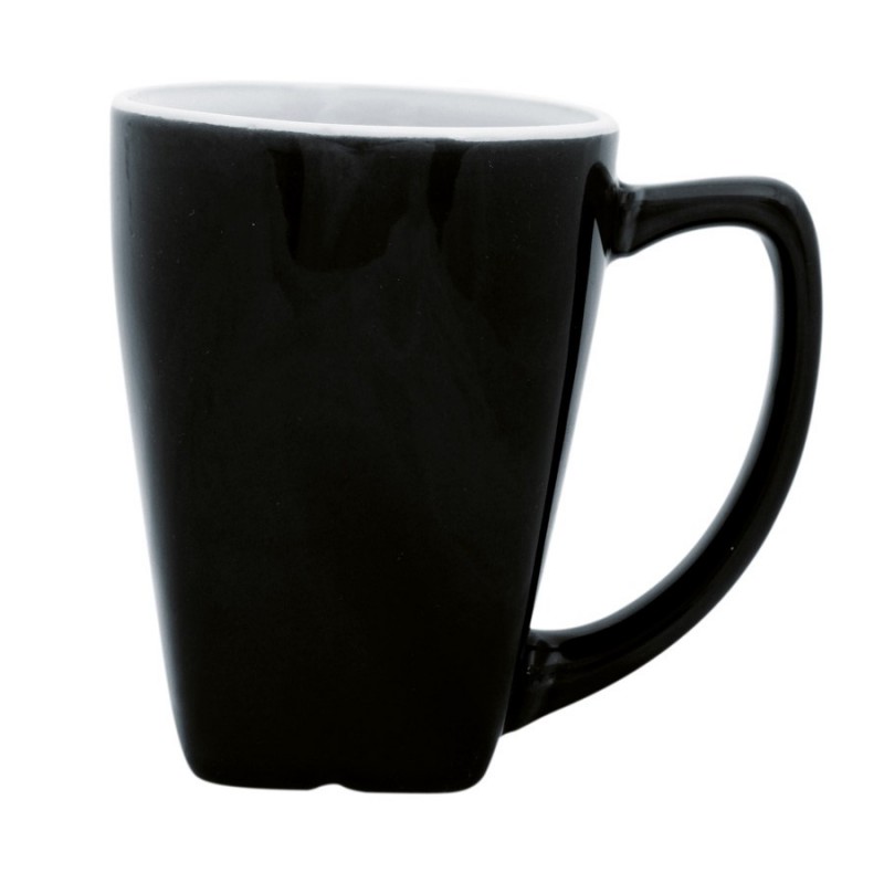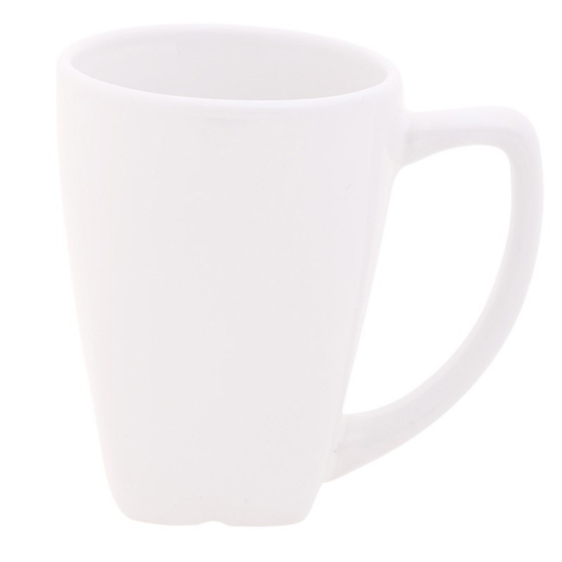 Stylish square ceramic mug with comfort-fit handle. 300ml capacity. Boxed.