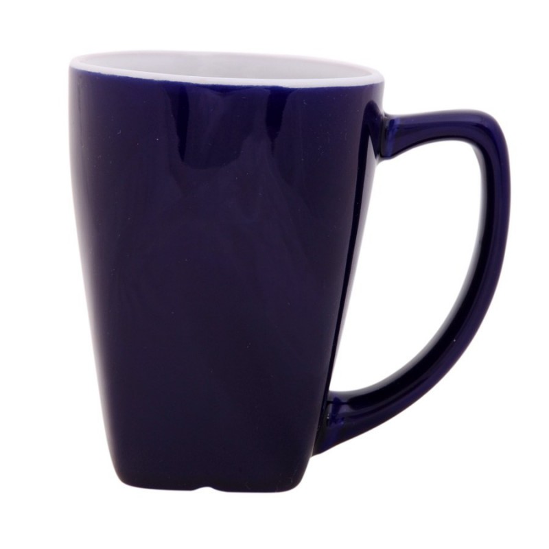 Unique design mug with white lining, external blue glossy finish and blue coloured handle.350ml capacity.