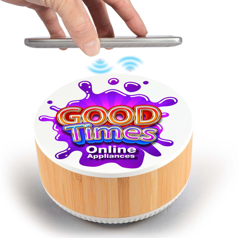 Bluetooth speaker with bamboo veneer body and wireless charger. The charger is 15W so fast charge capable with using a fast charge cable and connected to a 9V/2A power source. When connected to a 5V/2A source its a 5W standard charger. Supplied with Type C cable. Hands free function built in. Enjoy music up to 8 hours and wirelessly up to 10 metres....