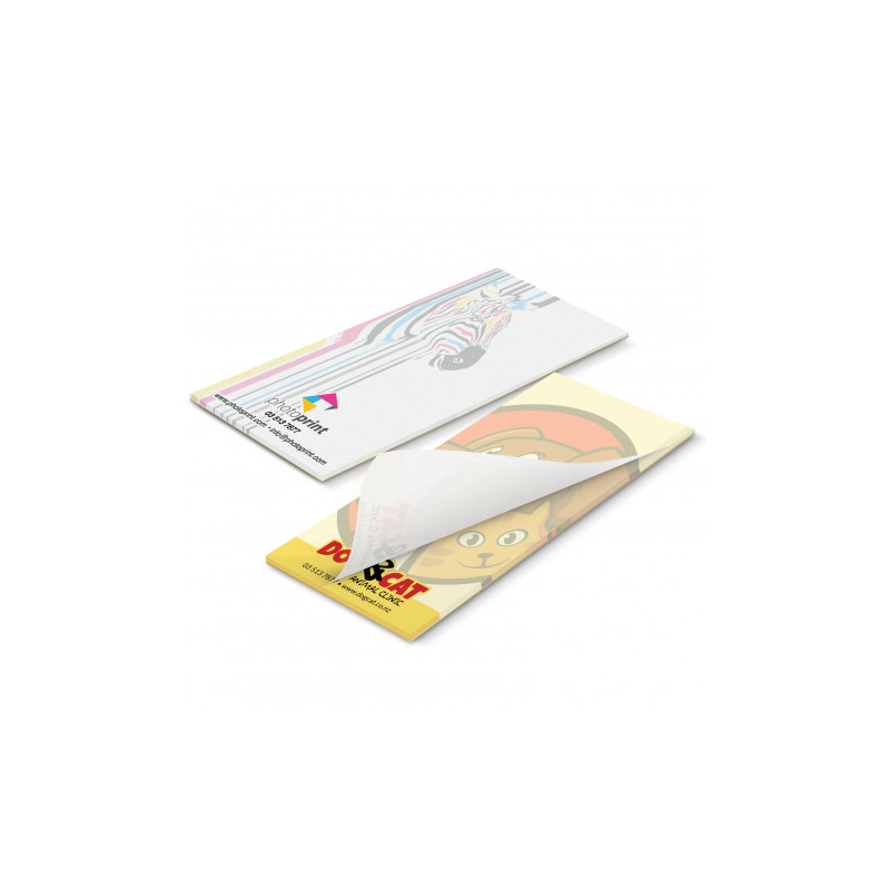 Horizontal DLE-size note pad which is padded on the long edge and fits in a standard DLE envelope for mailing. It has 50 leaves of quality 70gsm paper and a cardboard back. The pad is printed using four colour process, which gives the option of unlimited spot colours or stunning full colour at no extra cost. PMS colour matches are only approximate....