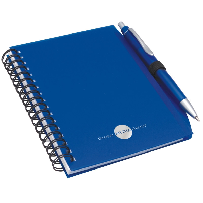 Top opening wiro bound pocket notebook with 50 leaves (100 pages) of lined paper. It has an elastic closure band, an elastic pen loop and a pen. Both the notebook and pen barrel are made of recycled paper and the plastic parts of the pen contain cornstarch material to reduce the amount of plastic used.