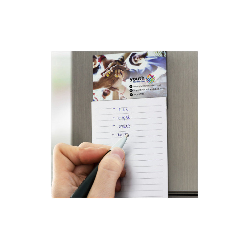 Handy A7 note pad which has 25 leaves of quality 70gsm paper and a magnetic holder which attaches to a fridge. Both the pad and the magnet can be branded in full colour and a separate setup charge for each is required. A production lead time of 20 working days applies to this product and it can only be ordered in the quoted order quantities.
