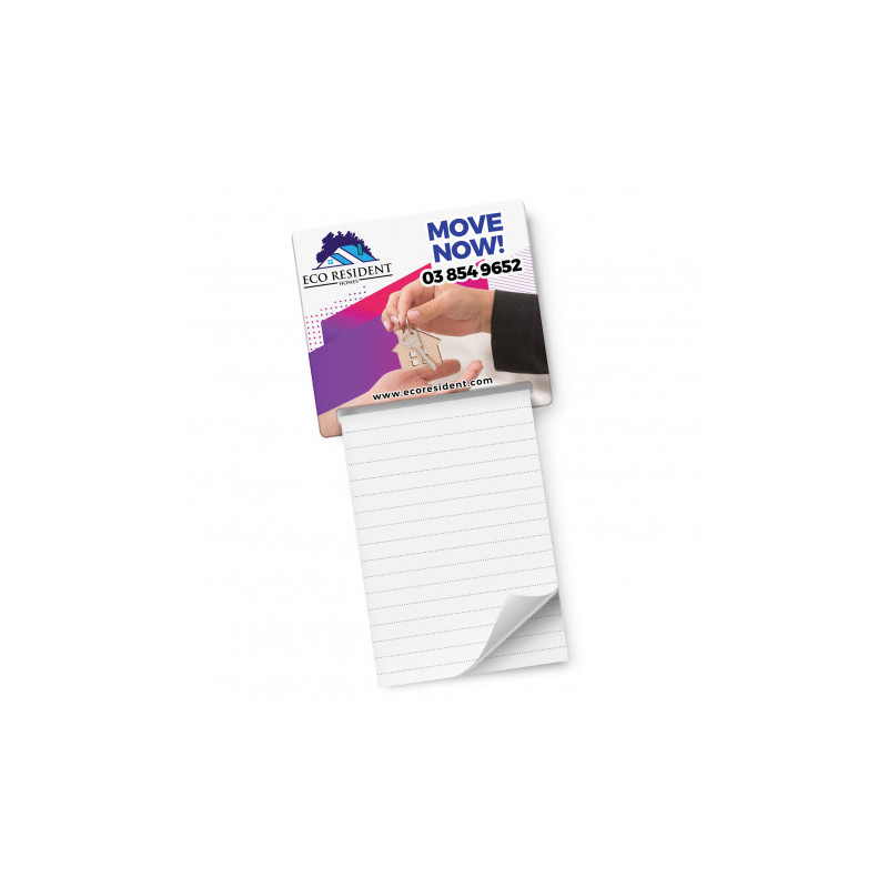 Handy A7 note pad which has 25 leaves of quality 70gsm paper and a house-shaped magnetic holder which attaches to a fridge. Both the pad and the magnet can be branded in full colour and a separate setup charge for each is required. A production lead time of 20 working days applies to this product and it can only be ordered in the quoted order quantities.
