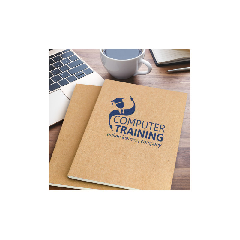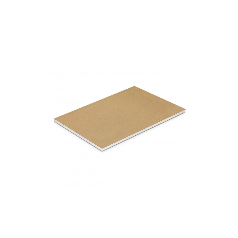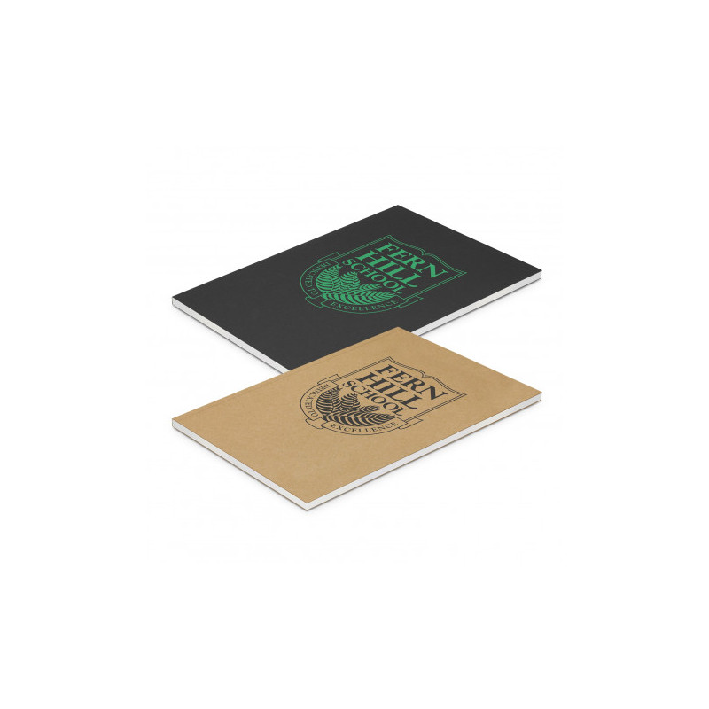 Fully customised A5 size, top opening notebook with silver wiro binding. It has 60 leaves (120 pages) of 70gsm cream paper which is available lined or unlined. Individual pages can be customised in one colour or full colour for an additional cost. The notebook has an 1100gsm unbleached grey cardboard back cover and a 350gsm cardboard front cover which can...