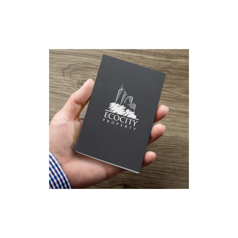 Fully customised A5 size, top opening notebook with silver wiro binding. It has 60 leaves (120 pages) of 70gsm cream paper which is available lined or unlined. Individual pages can be customised in one colour or full colour for an additional cost. The notebook has an 1100gsm unbleached grey cardboard back cover and a 350gsm cardboard front cover which can...
