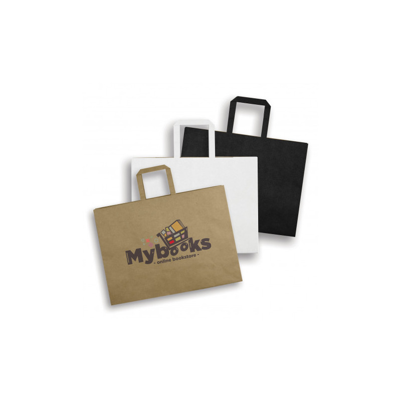 Medium size paper carry bag with strong paper rope handles and gusset, made of 150gsm kraft paper. Is the perfect branded bag for all sale items.