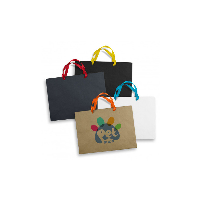 Medium-sized carry bag made from 180gsm FSC-certified materials with coloured ribbon handles. The gusset and top edge are reinforced for added strength.