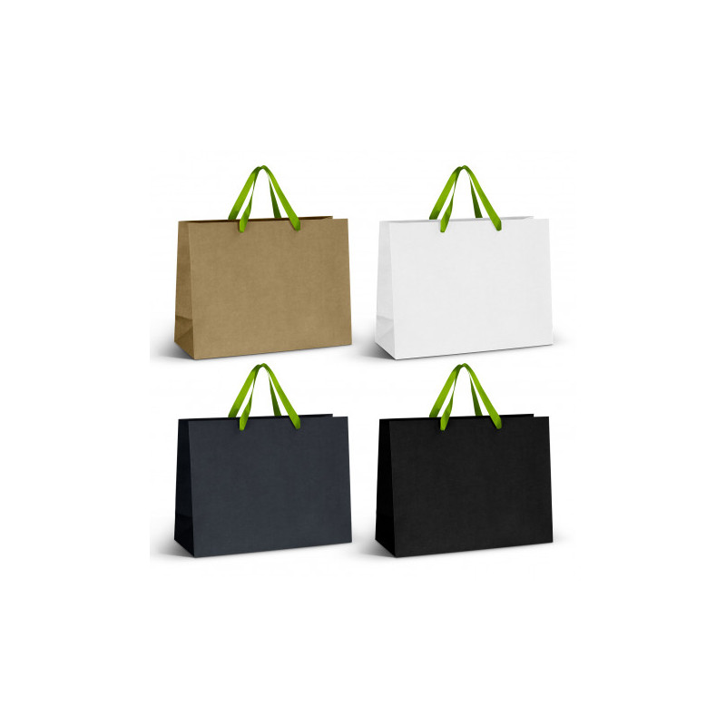 Large carry bag made from 180gsm FSC-certified materials with coloured ribbon handles. The gusset and top edge are reinforced for added strength.