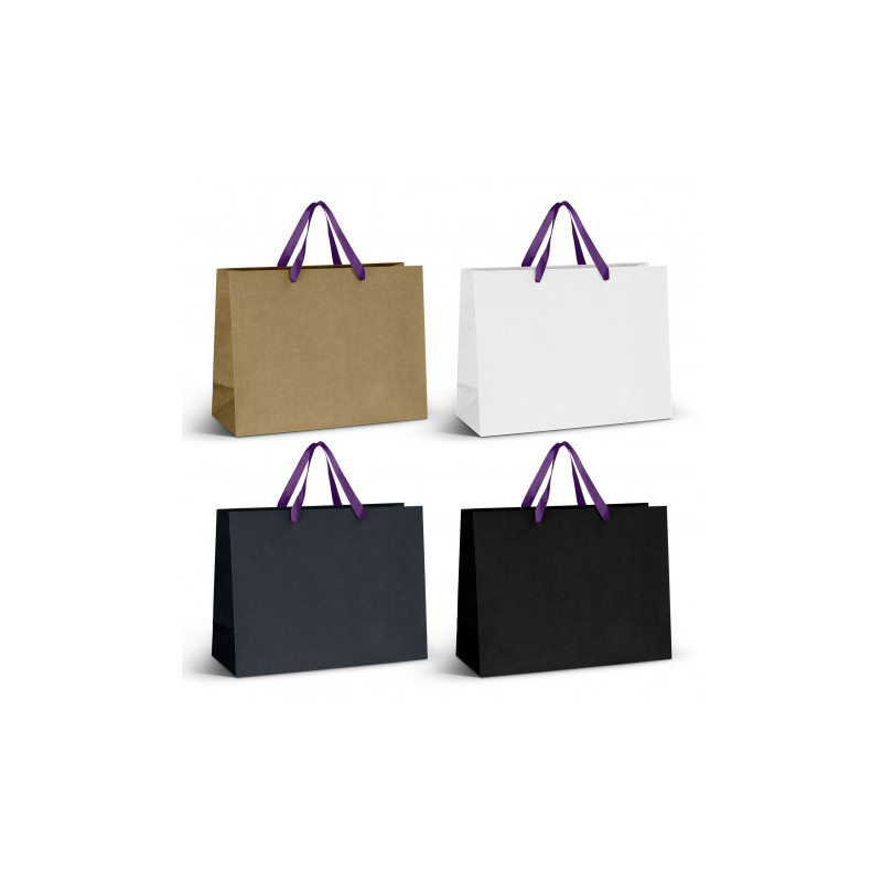 Extra large paper carry bag made from 180gsm FSC-certified materials with a reinforced base and square-folded 100gsm paper handles. This bag is landscape orientated with handles and gusset along the longer edges.