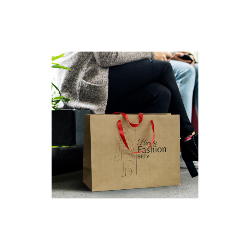 Medium size paper carry bag with strong paper rope handles and gusset, made of 150gsm kraft paper. Is the perfect branded bag for all sale items.