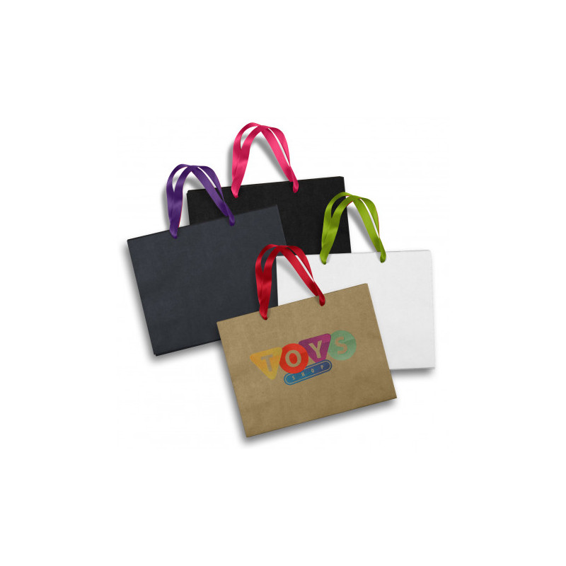 Medium-sized carry bag made from 180gsm FSC-certified materials with coloured ribbon handles. The gusset and top edge are reinforced for added strength.